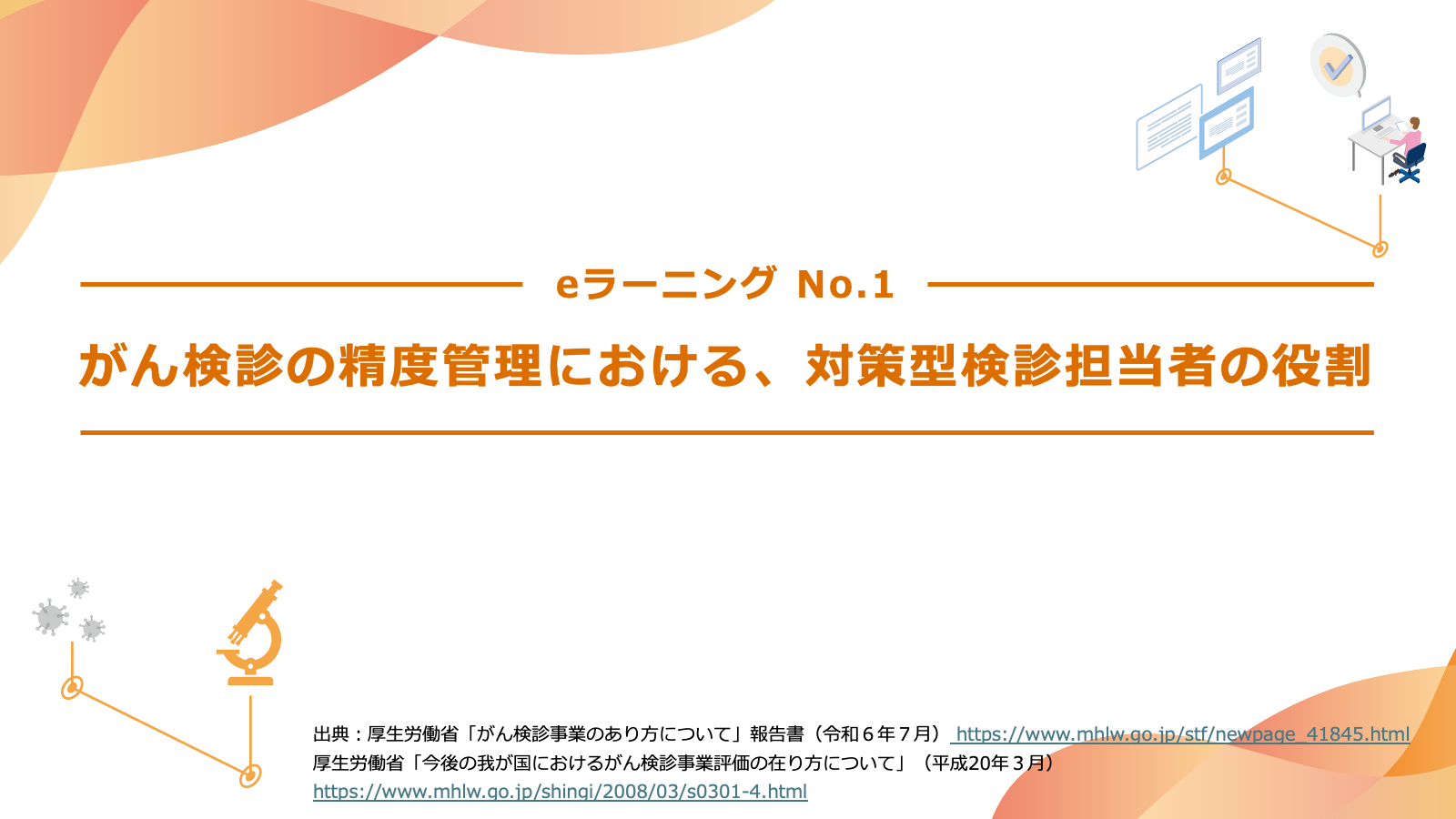 0% eラーニング No.1 こちらでは「がん検診の精度管理における、対策型検診担当者の役割」について解説しています。 まずはPDF資料を参照してください。 1. テキストを確認する その次に、「eラーニングを受講する」から理解度を確認する設問にお答えください。 各設問が正しいか、誤っているかを選択いただく形式です。 1 / 2 Q1. 検診機関が行う検診の精度管理とは、自施設の検査精度を高めることだけを指す。 ○ × 正解は✕ 対策型検診を担う検診機関は、自施設の検査精度を高めるだけでは不十分です。がん検診は対象者管理や受診勧奨、データ報告など複数の工程から成り、それらを含む事業全体の体制整備と運用管理に取り組むことが「検診の精度管理」です。 検診工程のうち検診機関が関与する部分について、具体的に求められる取組は「事業評価のためのチェックリスト(検診機関用)」に示されています。チェックリストの項目には、検査精度向上に加えて、受診者への対応や精検結果の把握、市区町村への報告なども含まれています。 2 / 2 Q2. 個別検診方式では、基本的に病院・クリニック・診療所が対策型検診の担当となる。 ○ × 正解は◯ 個別検診では、基本的に病院・クリニック・診療所といった個々の医療機関が対策型検診の担当となります。各医療機関は、仕様書に基づいて検診を実施すること、自施設の精度管理水準を継続的に向上させること、都道府県・市区町村が実施する精度管理向上の取組に協力することが求められます。 都道府県・市区町村が行うモニタリングのために、病院・クリニック・診療所がそれぞれ個別に、求められたデータを提出します。 例外として、医師会が加盟医療機関の体制を統一できる場合は、医師会を 1つの検診機関とみなし、医師会がモニタリングの対象となります。加盟医療機関は医師会の方針に沿って体制整備を行い、必要なデータ提出等を行います。 再テストする 一覧に戻る