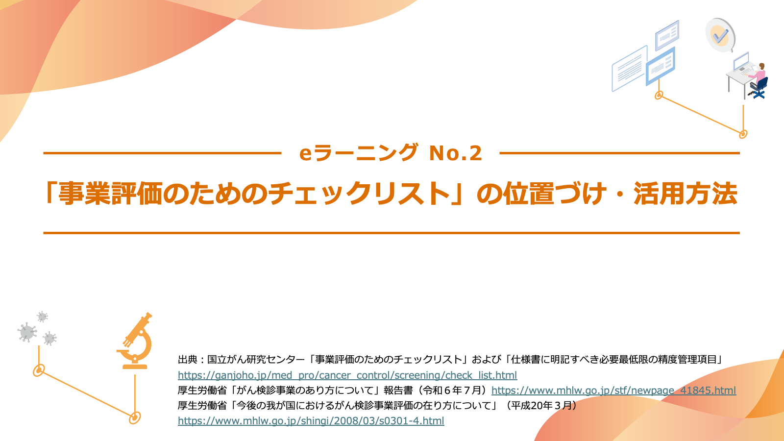 0% eラーニング No.2 こちらでは「事業評価のためのチェックリストの位置づけと活用方法」について解説しています。 まずはPDF資料を参照してください。 1. テキストを確認する その次に、「eラーニングを受講する」から理解度を確認する設問にお答えください。 各設問が正しいか、誤っているかを選択いただく形式です。 1 / 5 Q1. チェックリストは、都道府県・市区町村・検診機関それぞれの役割を基に、“最低限整備すべき技術・体制”を整理したものである。 ○ × 正解は✕ チェックリストは、都道府県・市区町村・検診機関それぞれの役割を踏まえて、最低限整備すべき技術や体制を項目化したものです。全項目の達成を目指すことが求められます。 なお、チェックリストだけで精度管理の状況を十分に評価できるものではありません。がん検診の質を的確に把握するには、受診率・要精検率・精検受診率といったプロセス指標と組み合わせて評価することが不可欠です。 チェックリストで「体制が整っているか」を確認し、プロセス指標で「実際の成果」を測ることで、精度管理上の課題を特定し、改善につなげることができます。 2 / 5 Q2. 検診機関が検査の一部を外注した場合、外注先の体制は外注先機関がチェックリストに回答する。 ○ × 正解は✕ チェックリストの回答者は、外注先ではなく、委託元である検診機関や医療機関です。 検診機関や医療機関が外注先検査機関の実施状況を確認し、その結果を自らの回答に反映させます。あくまで委託元の検診機関が責任を持って回答する仕組みです。 なお、医師会が加盟医療機関の体制を完全に統一している場合には、医師会が代表して回答し、外注先の状況も医師会が確認して回答に反映します。 3 / 5 Q3. 精度管理指標値を評価する際、平均値を用いて全体の水準を把握することは有効であり、それだけで課題の特定も十分に行える。 ○ × 正解は✕ 平均値を算出すること自体は、全体の水準を把握するために有効です。しかし、それだけでは課題を特定することはできません。 例えば平均値が良好に見えても、一部の自治体や検診機関の値が他と大きく乖離している場合があり、そのような偏りは平均値だけでは把握できません。 このため、精度管理水準を評価する際には、平均値に加えて、市区町村別や検診機関別のばらつきを可視化し、極端に乖離した事例を抽出して原因を究明することが欠かせません。 4 / 5 Q4. 検診機関がチェックリストに正確に回答することは、個々の施設の点検にとどまらず、地域全体のモニタリング精度を高め、課題を正しく特定することにつながる。 ○ × 正解は◯ チェックリストは、各検診機関が自施設の体制を点検するだけでなく、都道府県や市区町村が地域全体の精度管理水準を把握するための基盤となります。 もし回答が不正確であれば、集計結果が実態とかけ離れ、他地域との比較やモニタリングの妥当性が損なわれ、課題を見逃す恐れがあります。一方で、各機関が正しく回答すれば、地域全体のデータの信頼性が高まり、ばらつきの抽出や原因究明を正しく行うことができます。 つまり、正しい回答は自施設だけでなく、地域全体のモニタリング精度の向上にもつながります。 そのため、精度管理の担当者は、各チェックリスト項目の内容や意図を普段から理解しておくことが重要です。 5 / 5 Q5. 精度管理の改善策を適切に立てるためには、チェックリストやプロセス指標値の分析だけでは難しい場合がある。 ○ × 正解は◯ チェックリストやプロセス指標値の分析は、精度管理の改善策を検討するうえで重要な手がかりになります。しかし、それだけでは不十分な場合があります。 例えば、チェックリストや数値の結果から「ばらつき」や「課題の存在」は把握できますが、なぜその課題が生じているのかといった背景要因までは明らかにならないことが多いからです。その場合、都道府県が市区町村や検診機関に対して訪問や聞き取り調査を行い、現場の運営体制や業務の実態を確認することが欠かせません。 こうした詳細な実態把握と組み合わせてはじめて、改善策を適切に立てることができます。 したがって、聞き取り調査が行われた際には、検診機関は協力し、正確な情報を共有することが必要です。こうした協力があることで、地域全体の精度管理改善がよりスムーズに進みます。 再テストする 一覧に戻る