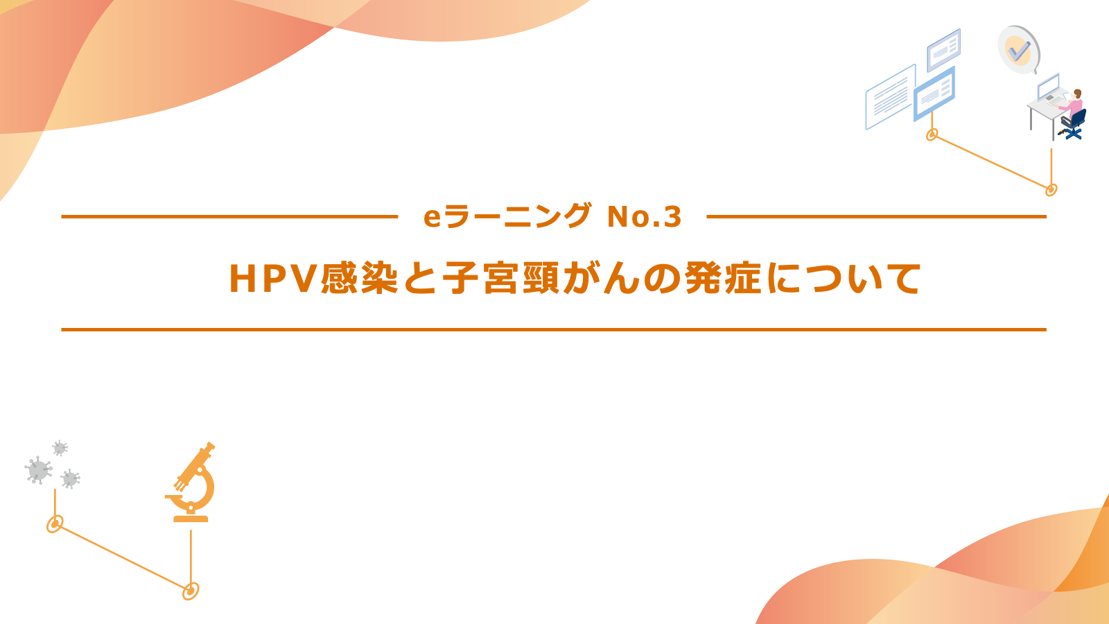 0% eラーニング No.3 こちらでは「HPV感染と子宮頸がんの発症について」について解説しています。 まずはPDF資料を参照してください。 1. テキストを確認する その次に、「eラーニングを受講する」から理解度を確認する設問にお答えください。 各設問が正しいか、誤っているかを選択いただく形式です。 1 / 5 Q1. HPVの内、高リスク型HPVは2種類である。 ○ × 正解は× 約15種類が子宮頸がんの「高リスク型HPV」と呼ばれています。 2 / 5 Q2. 子宮頸部の細胞に異常がなくてもHPVに感染している場合がある。 ○ × 正解は◯ 子宮頸部の細胞に異常がない女性のうち、10~20%程度の方がHPVに感染していると報告されています。 3 / 5 Q3. 子宮頸部前がん病変の多くが高リスク型HPVに感染している。 ○ × 正解は◯ CIN1:80%で高リスク型HPVが陽性 CIN2:ほぼ全例で高リスク型HPVが陽性 CIN3:ほぼ全例で高リスク型HPVが陽性 AIS :ほぼ全例で高リスク型HPVが陽性 4 / 5 Q4. 子宮頸部扁平上皮がんの約半数がHPVに感染している。 ○ × 正解は× HPV関連とHPV非依存性に分類され、大部分がHPV関連扁平上皮がんが占めます。 5 / 5 Q5. 高リスク型HPV感染から子宮頸癌になるまで数年から数十年かかる。 ○ × 正解は○ 子宮頸がんは高リスク型HPVに感染してからがんに発展するまで数年から数十年かかります。 再テストする 一覧に戻る